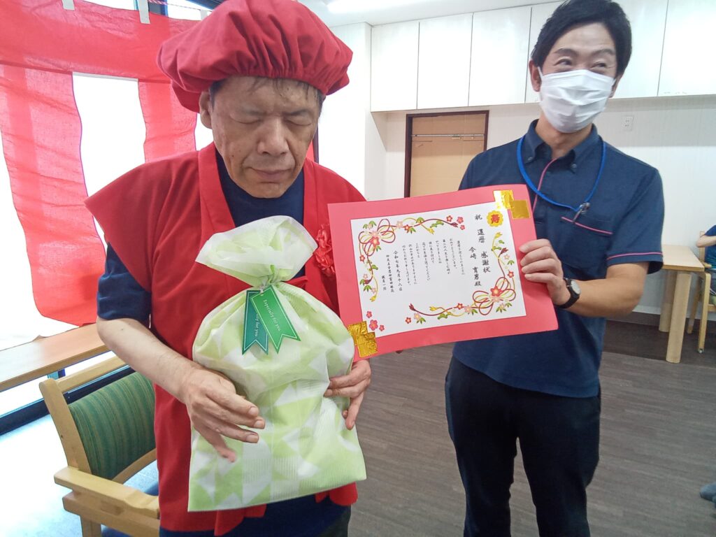 今年度還暦を迎えられた2名の方に感謝状とお祝いの品をお渡ししました。
