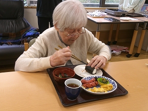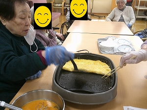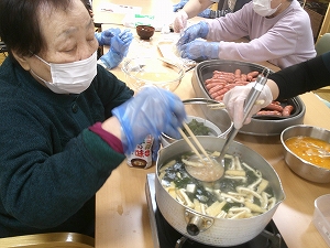 おにぎりを握ったり、包丁で具材を切って味噌汁をつくったり、卵焼きやウインナーを焼いたり、全部ご利用者の方とスタッフと力合わせて頑張りました。皆様テキパキとしてくださいました。