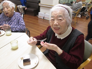 楽しまれた後はおやつのケーキです。「おいしいよ~」と召しあがっていました。