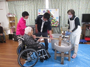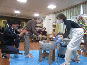 「よいしょ~」と皆さんで掛け声をしながら餅をついていただいました。