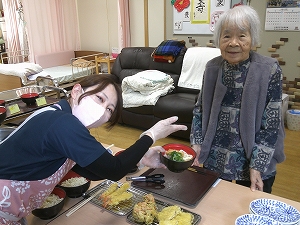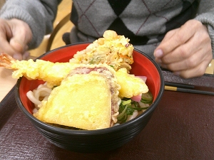 そして、うどん屋さんのように、お好きな天ぷらを選びに行きました。「エビがいい」などお好きなものを選んでいただきました。