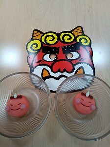 鬼をやっつけた後はおやつです。栄養士さんがかわいい鬼の練りきりを準備してくれました。「かわいい!」と好評でした。